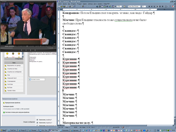 Технология простая. Файлы выпусков передачи беру с рутрэкера, с раздачи confor. Там всё оперативно выкладывается. Размер файла около 290 мб. Правда, сейчас архив ста выпусков под 30 гб. Зато архив, всё есть. Открываю плейер, в частности, KMPlayer, в небольшом окошке. На остальной ширине экрана - Ворд. Послушаю фразу или часть, набираю. И так далее. Замедление речи можно делать в KMPlayer'е или GOM-Player'е, только это многого не даст - речь будет искажаться, могут быть ошибки. Можно попробовать. Кому-то индивидуально может и подойдет. Фамилии, которые испльзуются часто, набраны столбиками, выделены болдом и подтаскиваются по необходимости - Сванидзе: Кургинян: Млечин: Материалы по делу. Экспертов представляют по ходу передачи, можно с экранной подписи добавить. Сергей Ервандович приводил схемки, я их вставлял в текст. Можно в начале текста перечислить всех экспертов, участвовавших в программе, собрать по завершении работы. Слова "аплодисменты", "смех" и т.д. не нужны. Аплодисменты там фальшивые. Для восклицаний есть восклицательный знак. Интонационные моменты пусть в записи смотрят. А у нас - протоколы суда. Точность текста нужна. Файлы лучше не сохранять как Word2007 (если у кого он), а как Word97. Он больше в ходу. |