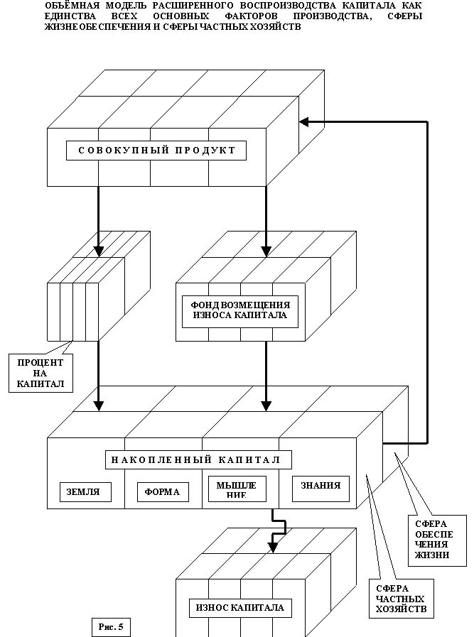 Поскольку человеческое общество в качестве капитала представляет собой единство связанных между собой производственных единиц, предприятий, то, используя категориальную пару общее-частное, можно выделить две качественно различные сферы производства: сферу обеспечения жизни и сферу частных хозяйств. Как следует из названия, сфера обеспечения жизни отвечает за обеспечение сохранения жизни частных членов общества, их объединений и общества в целом. Все частные члены общества, их объединения и, общество в целом, решая свои частные проблемы, тем не менее, опираются на систему обеспечения жизни. Объединив всё вместе - мы получаем ОБЪЁМНУЮ МОДЕЛЬ РАСШИРЕННОГО ВОСПРОИЗВОДСТВА КАПИТАЛА КАК ЕДИНСТВА ВСЕХ ОСНОВНЫХ ФАКТОРОВ ПРОИЗВОДСТВА, СФЕРЫ ЖИЗНЕОБЕСПЕЧЕНИЯ И СФЕРЫ ЧАСТНЫХ ХОЗЯЙСТВ. См. рис. 3 рис. 4 рис. 5 (Продолжение следует) Сообщение отредактировал Евсеев Борис - 10.9.2010, 1:33 |